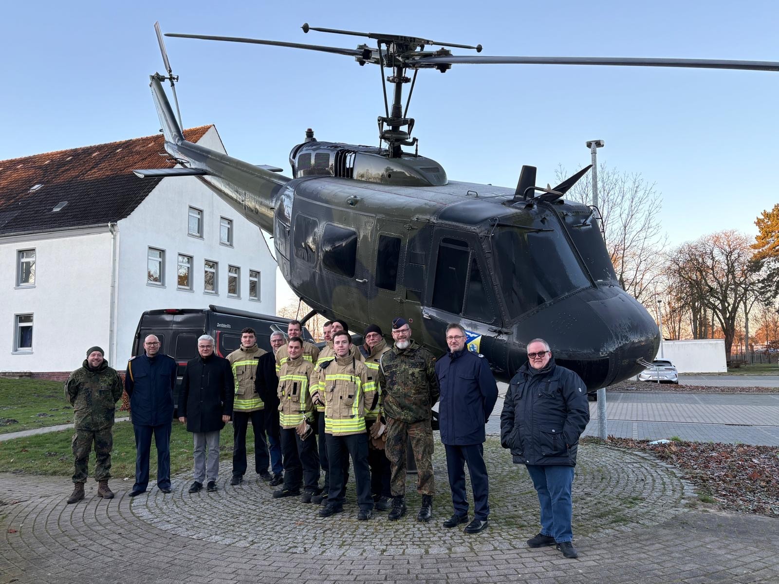 Wie in einer Pressemitteilung berichtet, wurde der Abgeordnete diesmal von dem CDA-Kreisvorsitzenden Heiko Huntemann (r.) und Ratsherr Gerhard Friedrichs (5.v.l.) begleitet. Gemeinsam überreichten sie einen Präsentkorb als Zeichen der Wertschätzung an die Diensthabenden von Bundeswehr und Feuerwehr.
