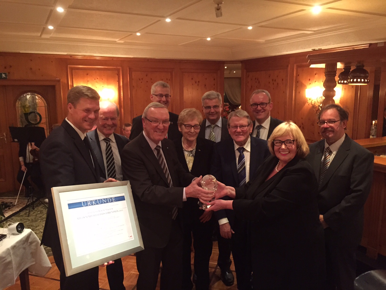 Nach der Laudatio überreichte die Kreisvorsitzende der Mittelstandsvereinigung Heide Bergbauer-Hörig dem Preisträger 2015 Egon Schumacher die Ehrenurkunde und die Mittelstands-Glasskulptur.